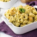 This Creamy Pesto Tortellini recipe features plump four cheese tortellini pasta swimming in a creamy pesto Alfredo sauce.